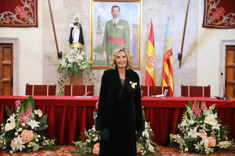 En el Salón del Trono del Cuartel General Terrestre de Alta Disponibilidad, antiguo convento de Santo Domingo, Mª José Llorens Esplugues recibió la medalla que le acredita como Honorable Clavariesa de las Fiestas Vicentinas de 2025.
